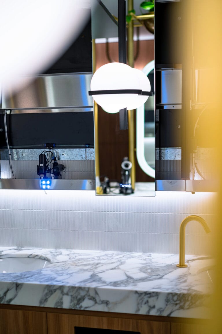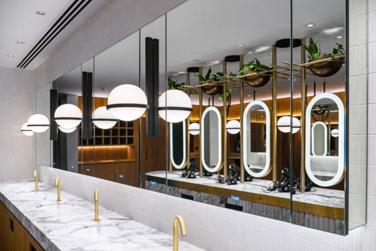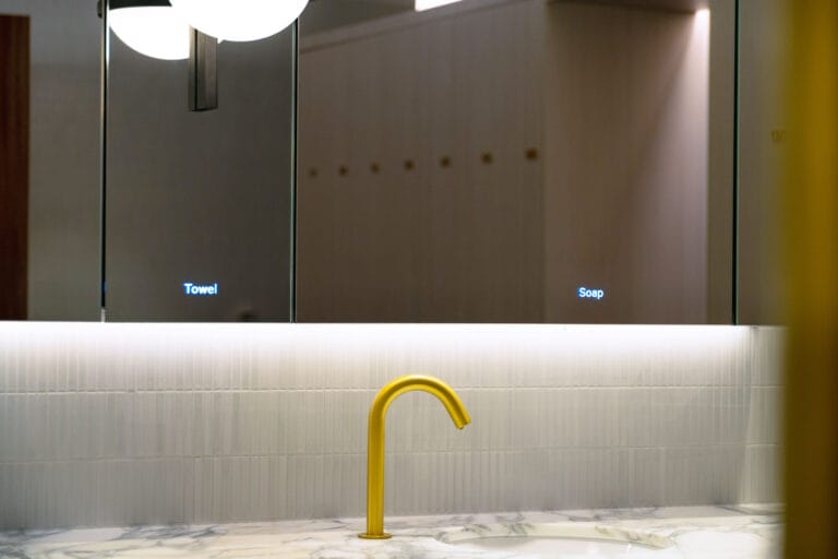 Precision designed by Dolphin’s team of architects, designers, and specifiers, the Alavo provides everything—tap, soap, sanitiser, and hand dryer—you need for a complete and thorough hand-washing experience all in one sleek and clutter-free washwall system. Dolphin ensured that the Alavo wash stations set up for the 20 Bond Street project were up to client’s specifications and mounted custom wall lights in between washpoints to create a feel of individual user experience and altogether complemented the washroom’s modern contemporary designs.