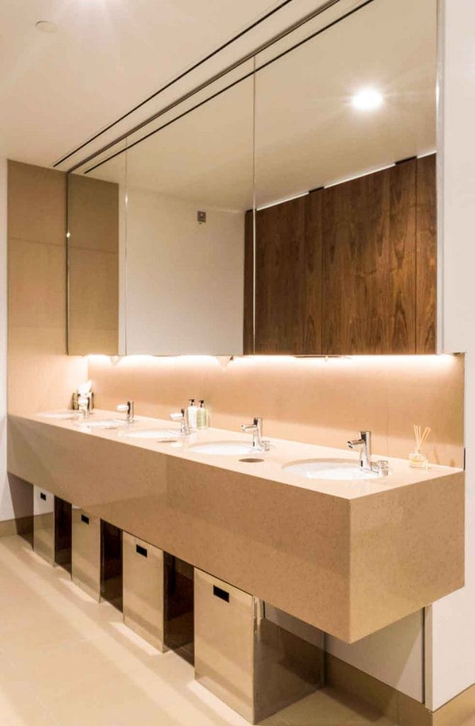 With an impressive atrium framing the city backdrop, the building’s washrooms had to be equally as impactful.