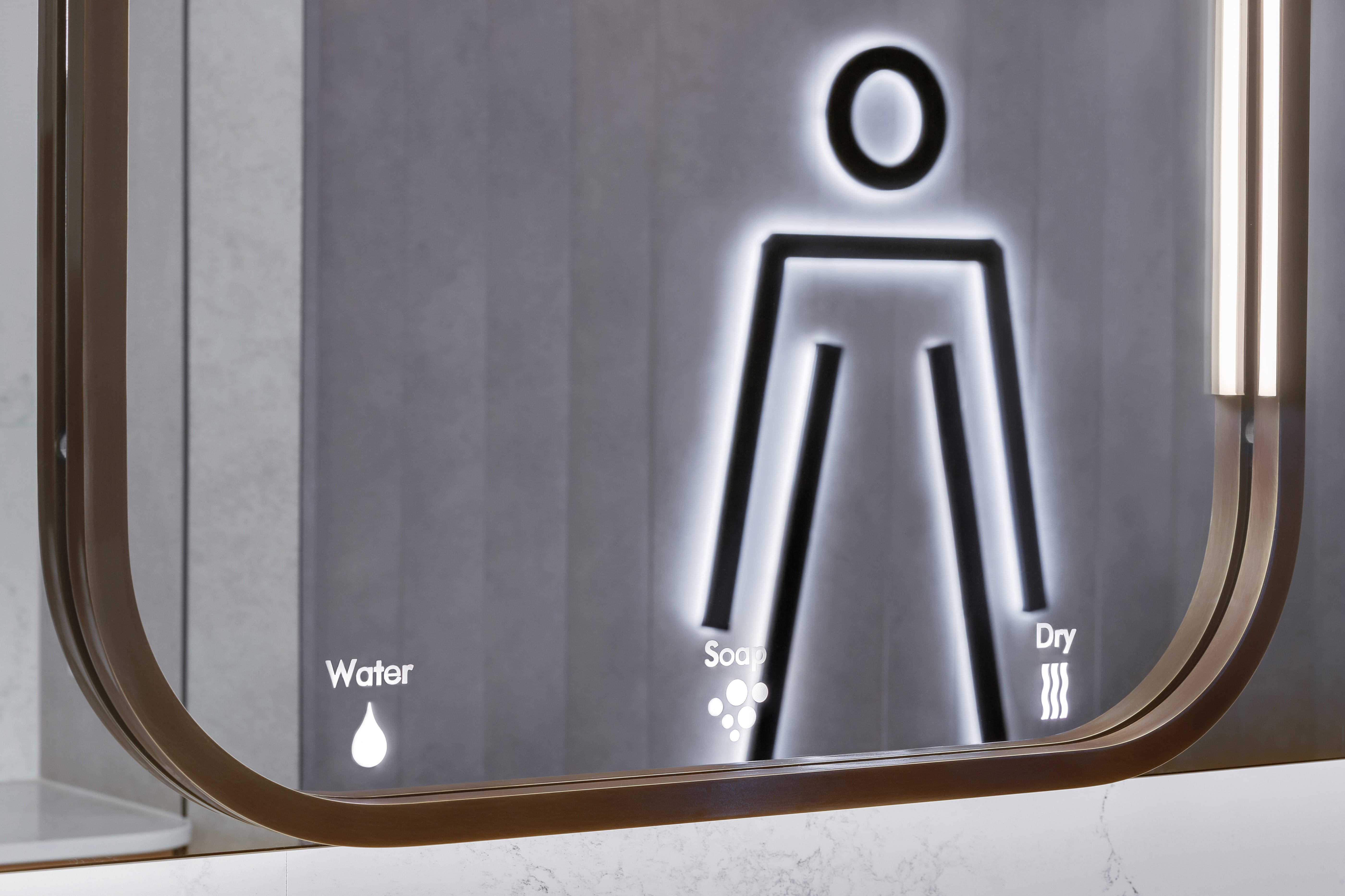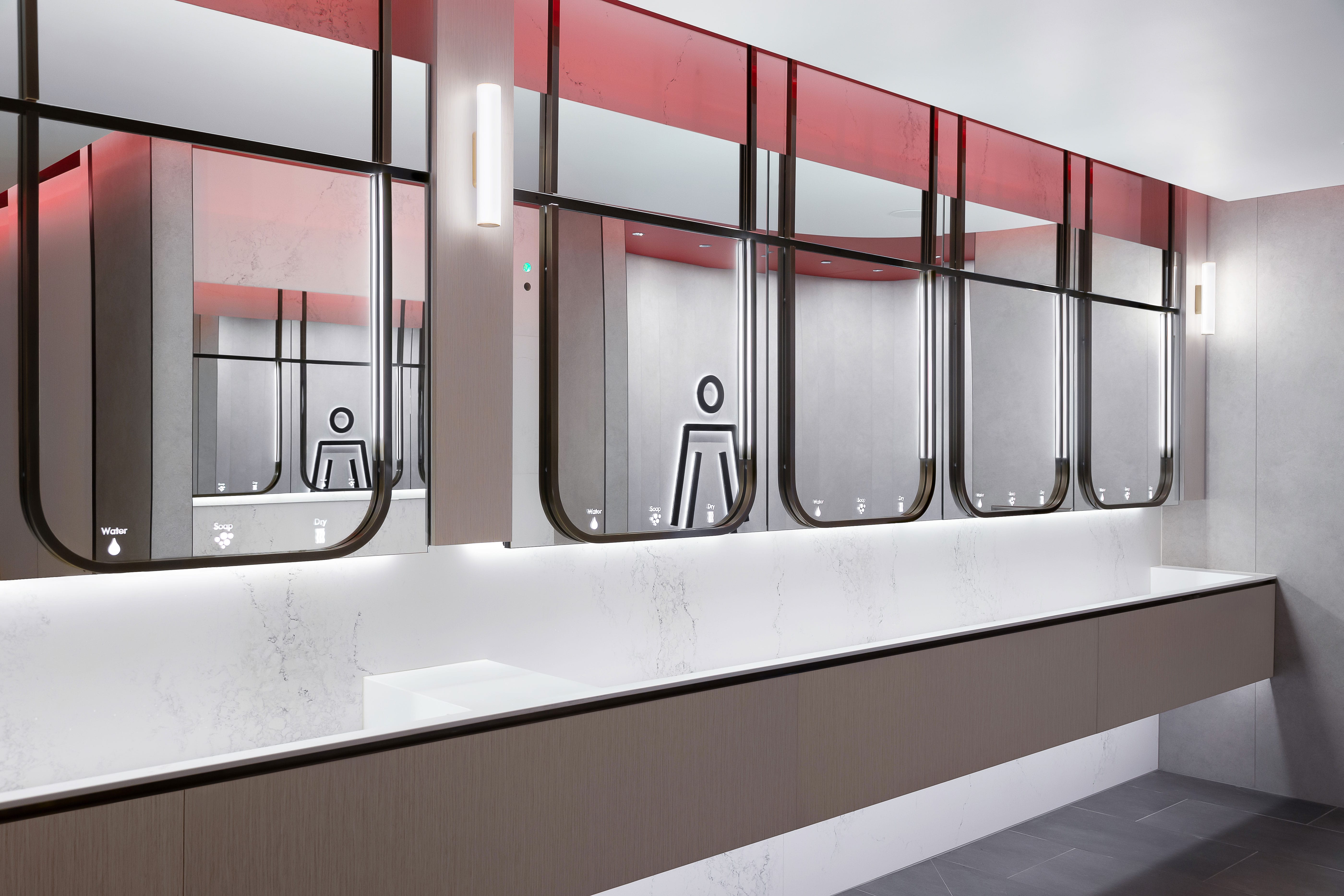 To create the feel of individual user experience, Dolphin set up Individual custom frames on mirror fronts per washpoint with their proprietary Alavo washwall systems and Corian wash troughs to complete the look.