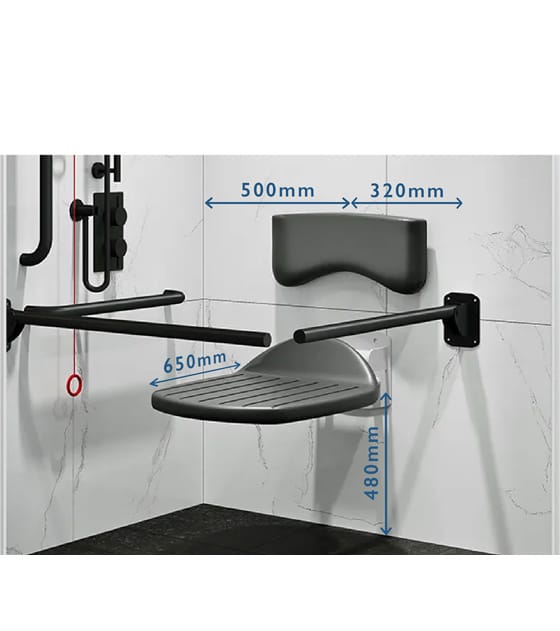 The Doc M shower seat should be mounted at a height of 480mm above the floor with a projection of 650mm. It should be installed 500mm from the wall when measured from the centre of the seat and 320mm from the drop-down grab rail.