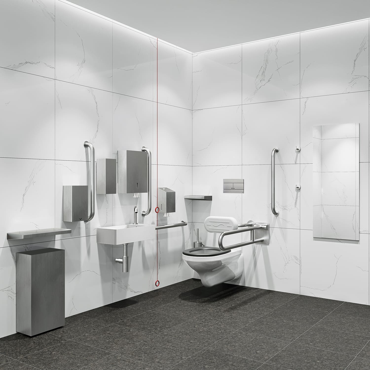 - All items of a co-ordinated design to achieve a consistent aesthetic look throughout the washroom