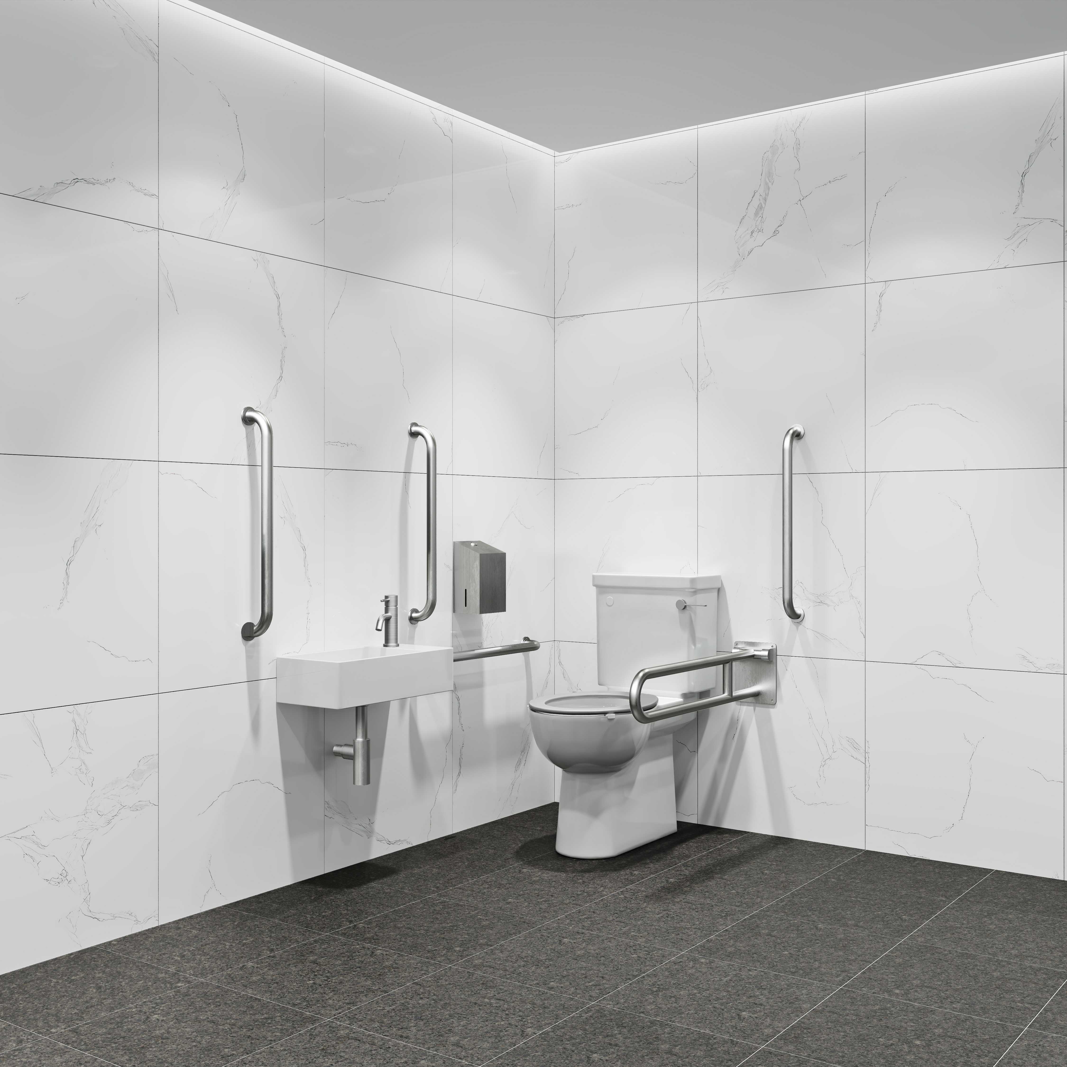 - All items of a co-ordinated design to achieve a consistent aestheticlook throughout the washroom