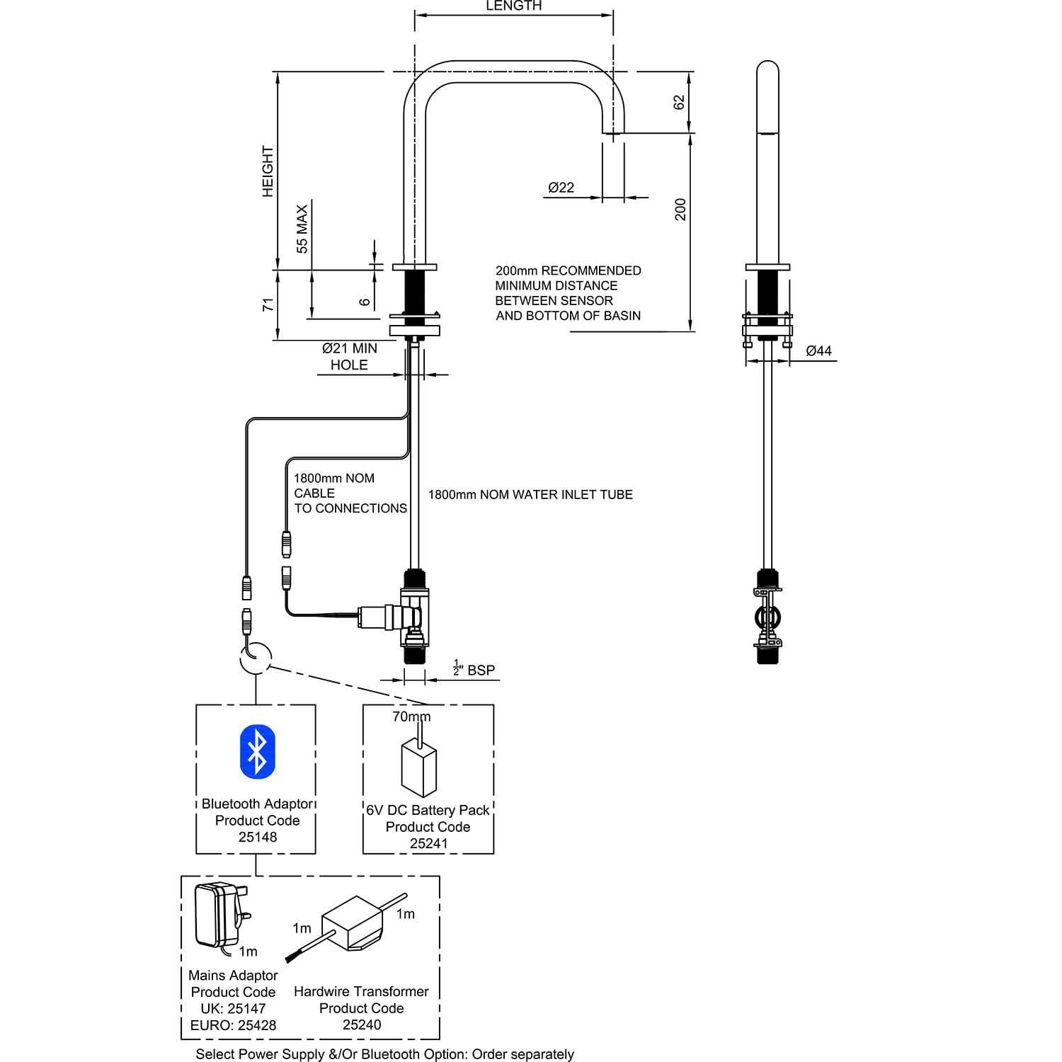 - Recommended minimum distance between the sensor and the bottom of basin = 200mm