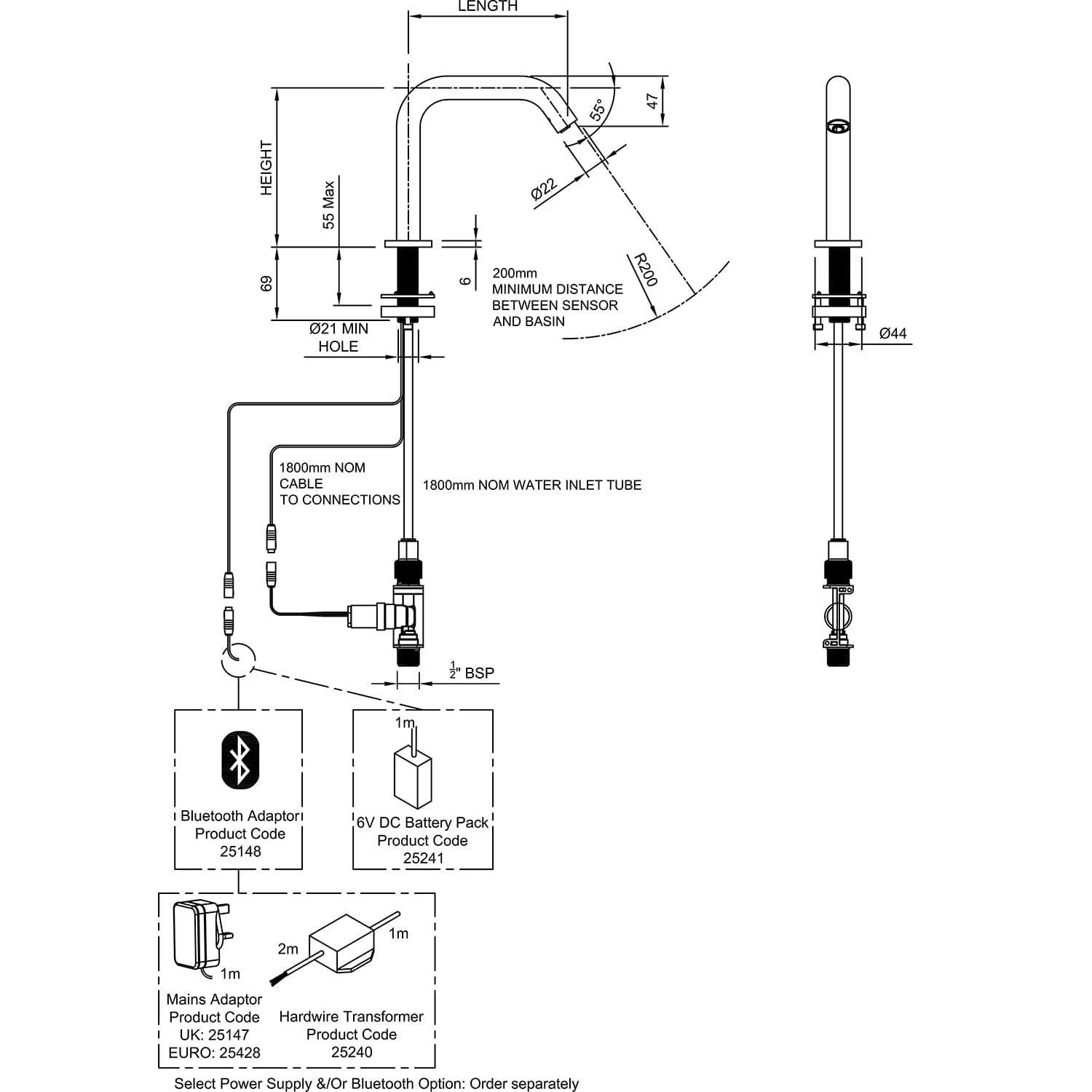 - Recommended minimum distance between sensor and the bottom of basin = 200mm